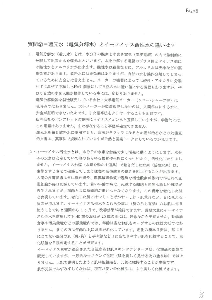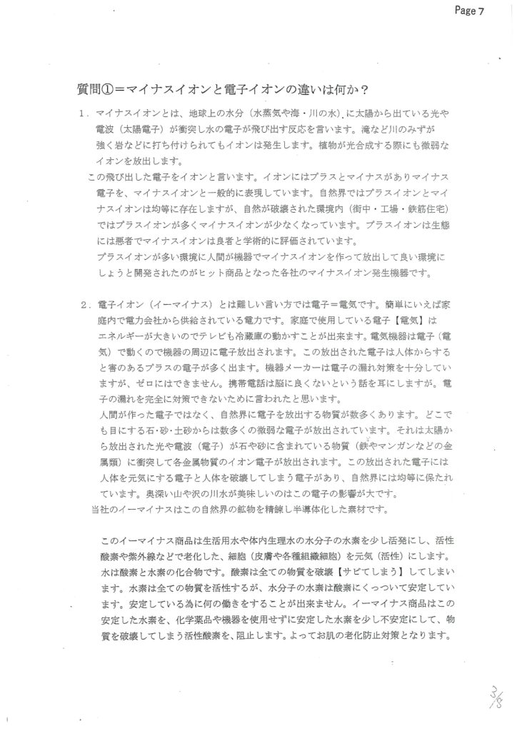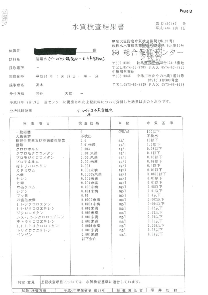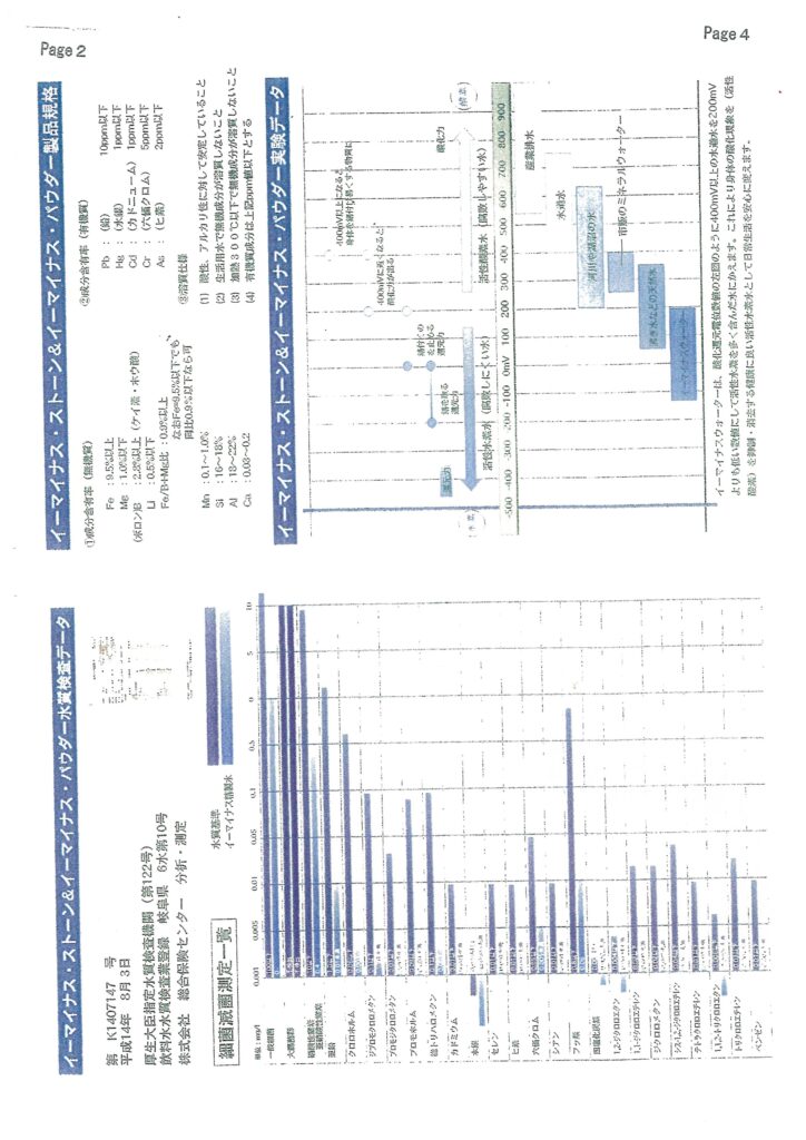 1.下記資料Page3は、水道水をイーマイナスストーンで処理して造った水素活性水の公の機関での検査結果